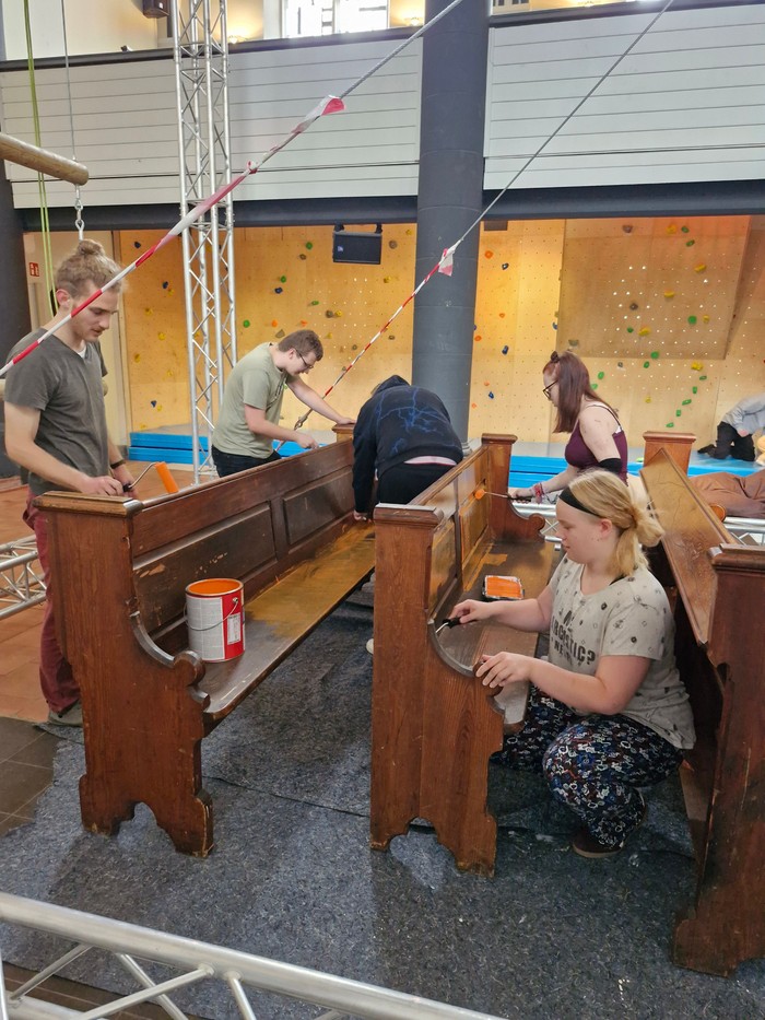 Jugendliche haben in der PauLA die Bänke, die aus der ehemaligen Kirche in Langendreer stammen, orange gestrichen.