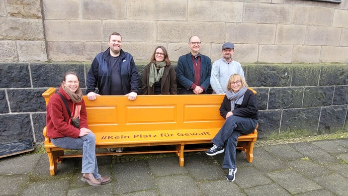 Teresa Thater und Susanne Reinelt (vorn v.l.) von der Präventionsstelle freuen sich mit dem Team der Kirchengemeinde Wiemelhausen – Holger Spies, Katja Roßbach-Blauth, Martin Röttger und Niklas Kreppel (hinten v.l.) – über die Bank, die vor der Melanchthonkirche ein sichtbares Zeichen gegen sexualisierte Gewalt setzt.